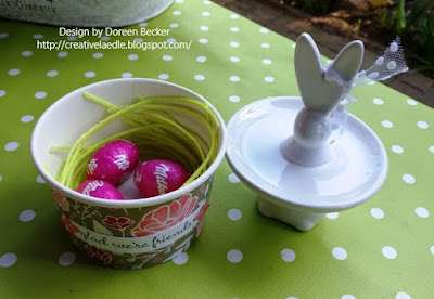 Für meine anwesenden Teammädels hatte ich süße kleine Porzellanhasen- Etageren im Depot entdeckt, die auch noch perfekt zu unseren Süssigkeiten Bechern im noch aktuellen Frühlingskatalog hineinpassten.
